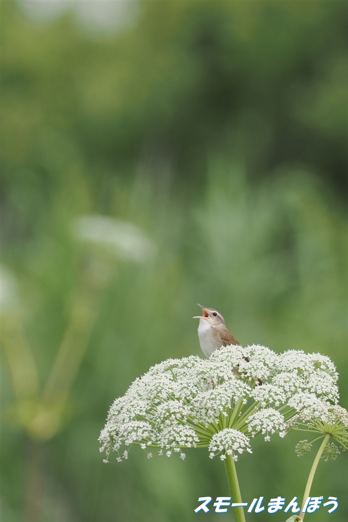 花の上で囀るシマセンニュウ(もう少し体が見えて欲しかった)