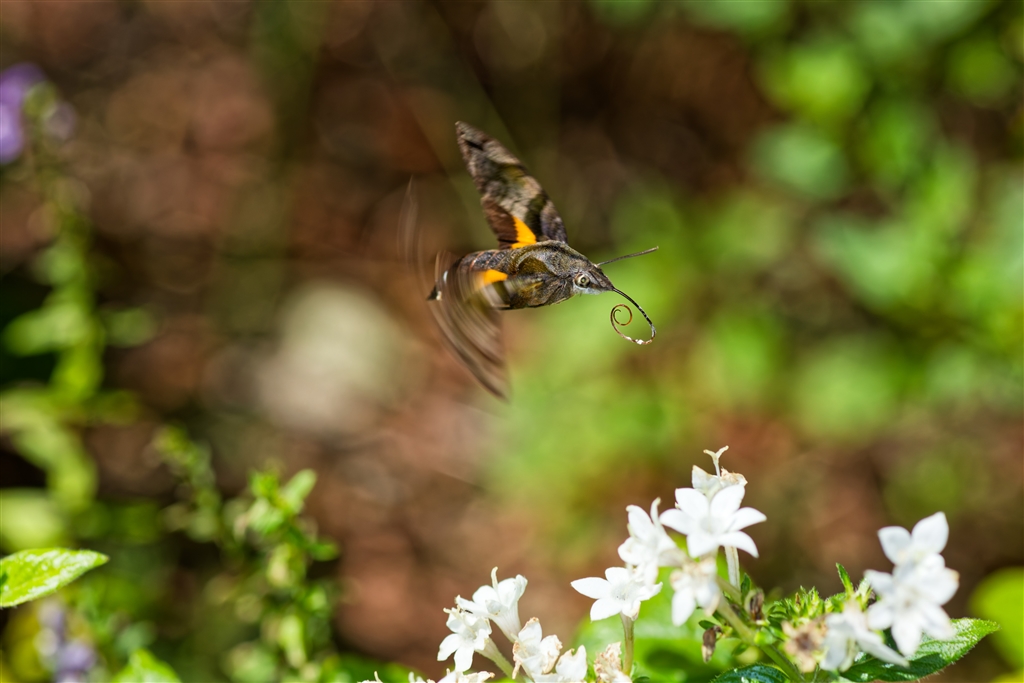 この時期になるとよく見かけるホウジャク(蛾の一種で飛びながらストローで吸蜜する)
