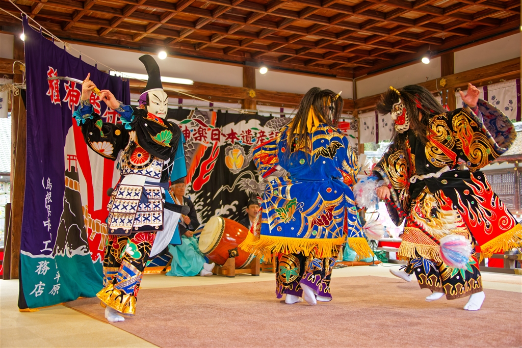 石見神楽「塵輪」:仲哀天皇が塵輪(翼を持ち自由に飛び回る悪鬼)と戦う