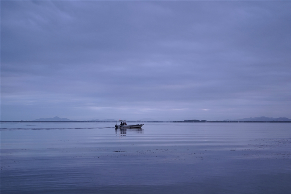 風が無く波もない湖面を小舟が行きます