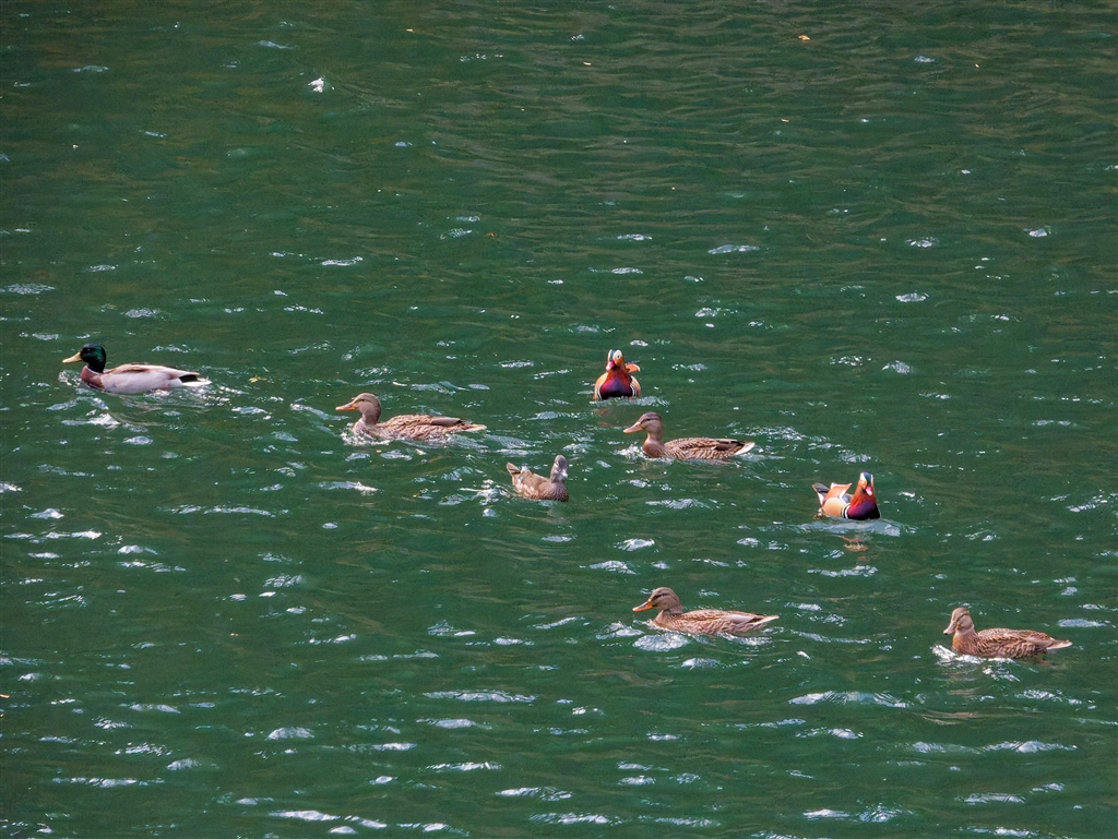 2025年初冬のオシドリ-2 @800o マガモに交じって川をゆっくり流れ下る
