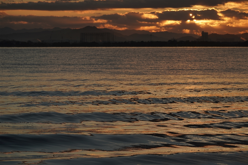 日の出の太陽で、波は金属のように輝きました