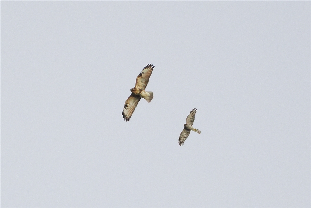 ハイタカ(右)がノスリ(左)をストーキング中(^_^ゞ