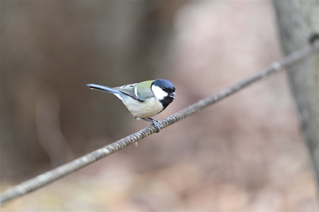 両脚でしっかり押さえて木の実の中身を食べるシジュウカラ