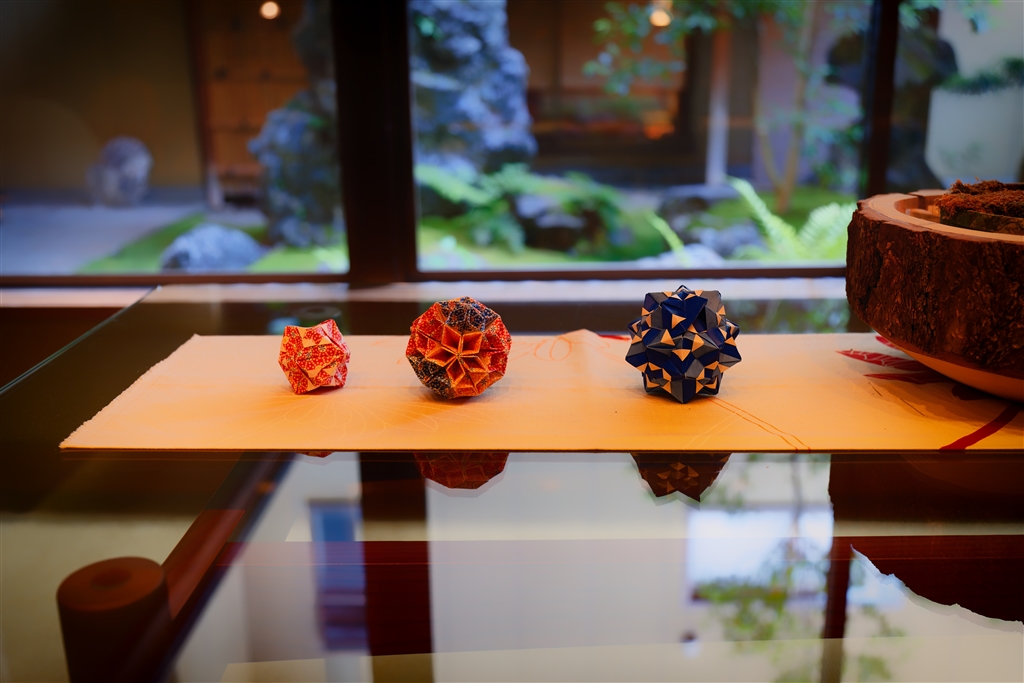 道後温泉、大和屋別荘にて。中庭を背景に折り紙のまりを主題にしたテーブルフォト。