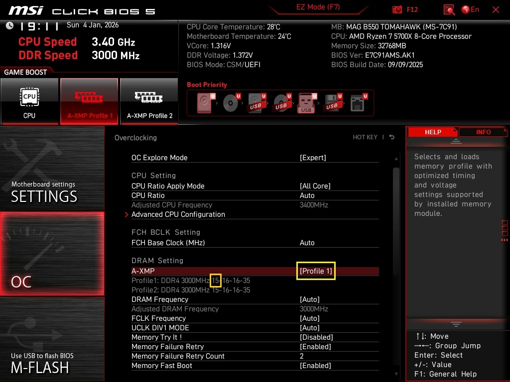 MAG B550 TOMAHAWKのBIOS設定例、黄枠がA-XMPのProfile、オレンジ枠がCL値