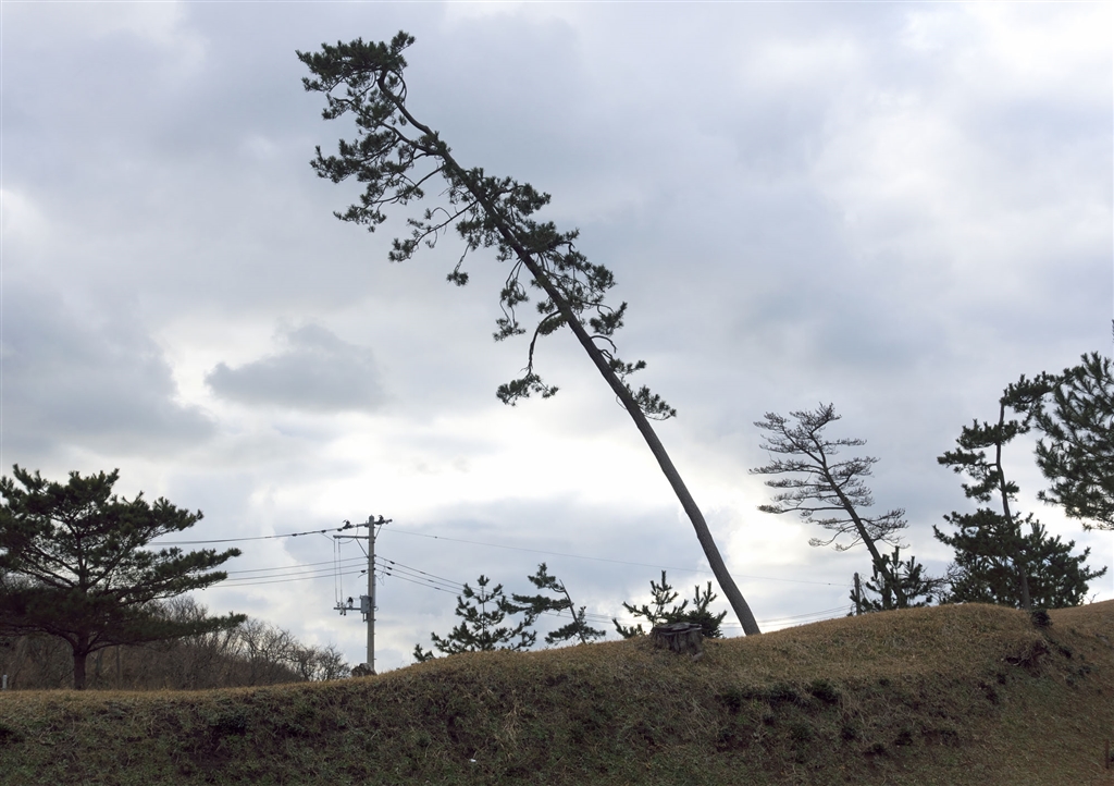 風で傾いた松