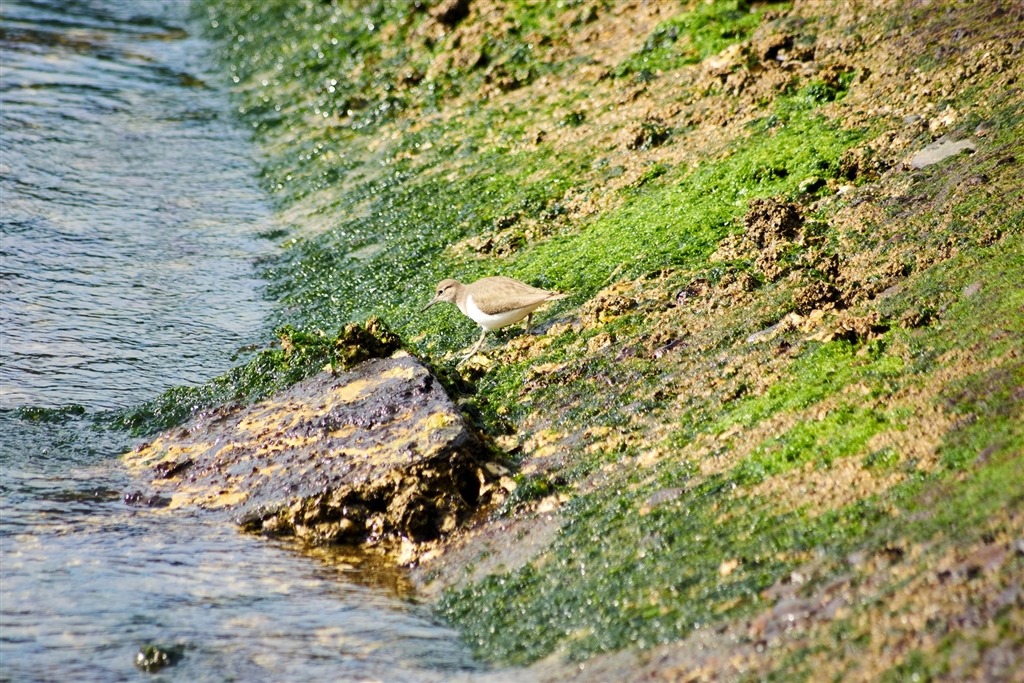 シギが潮の引いだ岩場の苔の辺りをついばんでいました