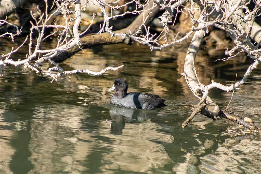 オオバンは黒一色だけど付き合いのいい楽しい水鳥です。