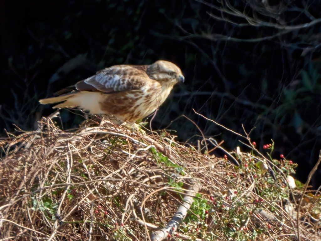 枯枝の堆積物にノスリが居た。2000mmZoomでゆっくり近づいていたら