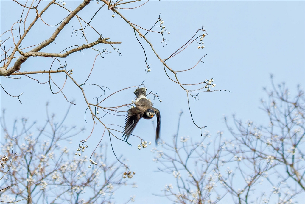 ナンキンハゼの大樹にムクドリが・・・飛び出す瞬間を捉えてパチリ