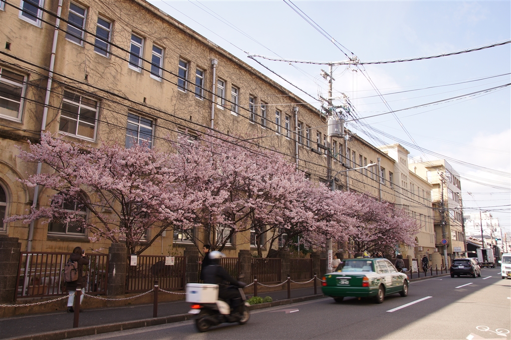 烏丸四条近くの旧成徳中学校の春めき桜(足柄桜?)です。