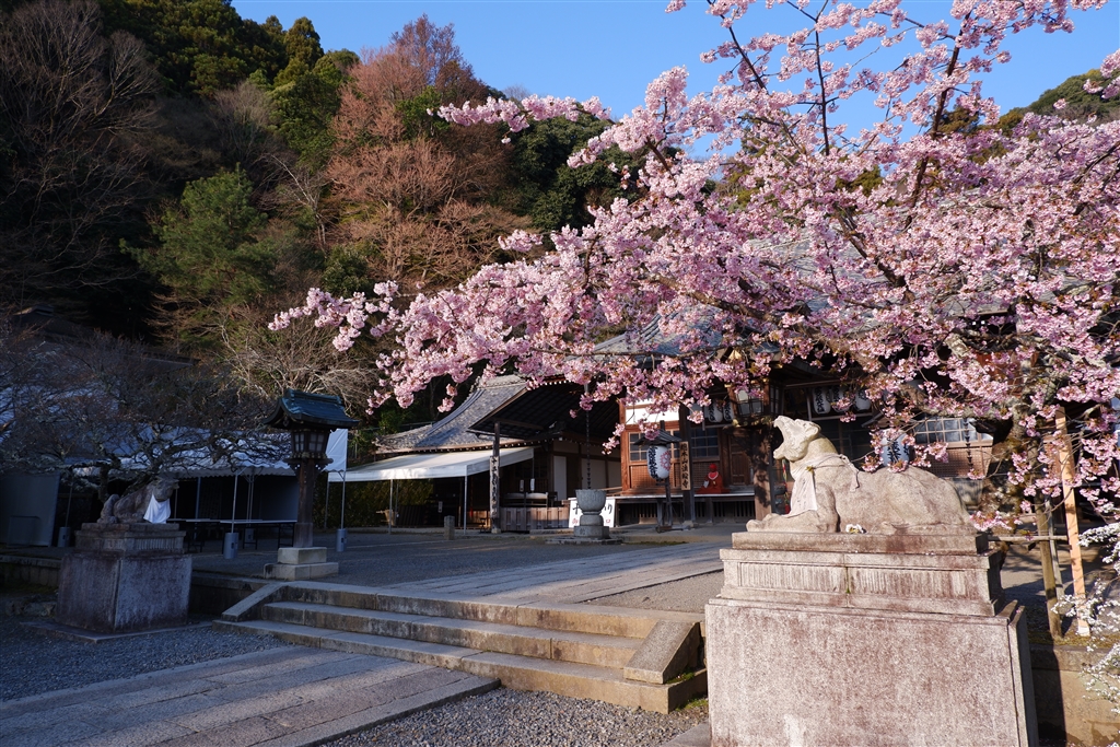 寒桜が見頃な虚空蔵法輪寺にて…狛虎と狛牛。