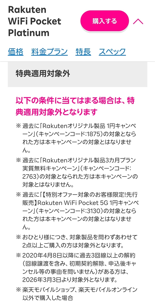 楽天端末:3回線以上解約者対象外