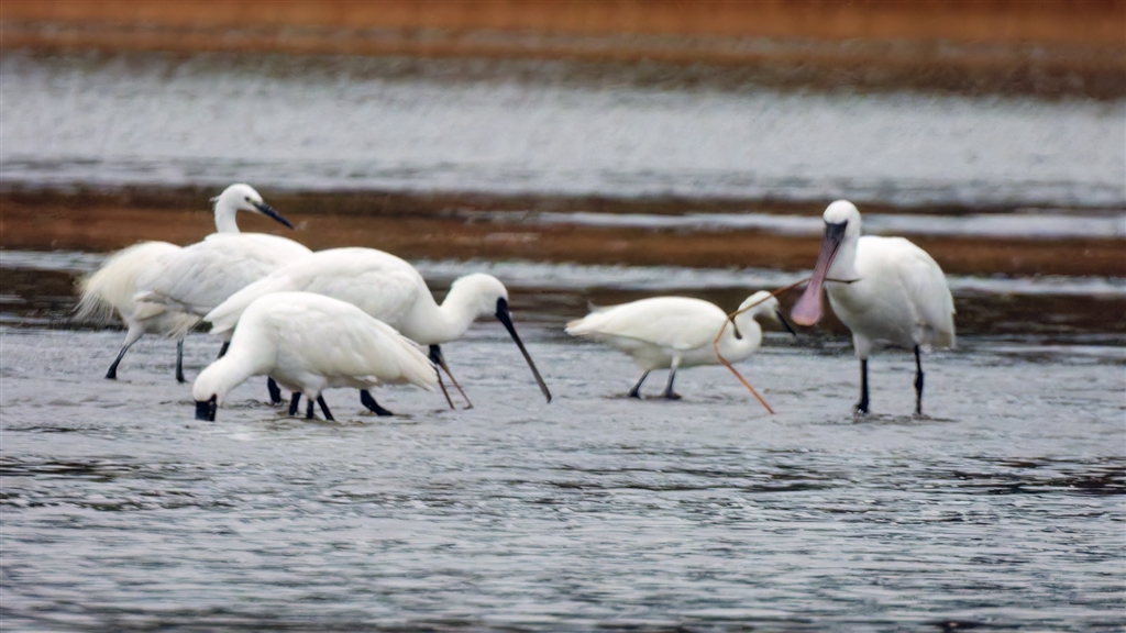 餌を仲間と漁るクロツラヘラサギ-1 @1700mm