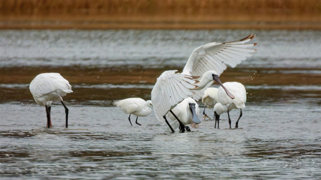 餌を仲間と漁るクロツラヘラサギ-3 @1700mm