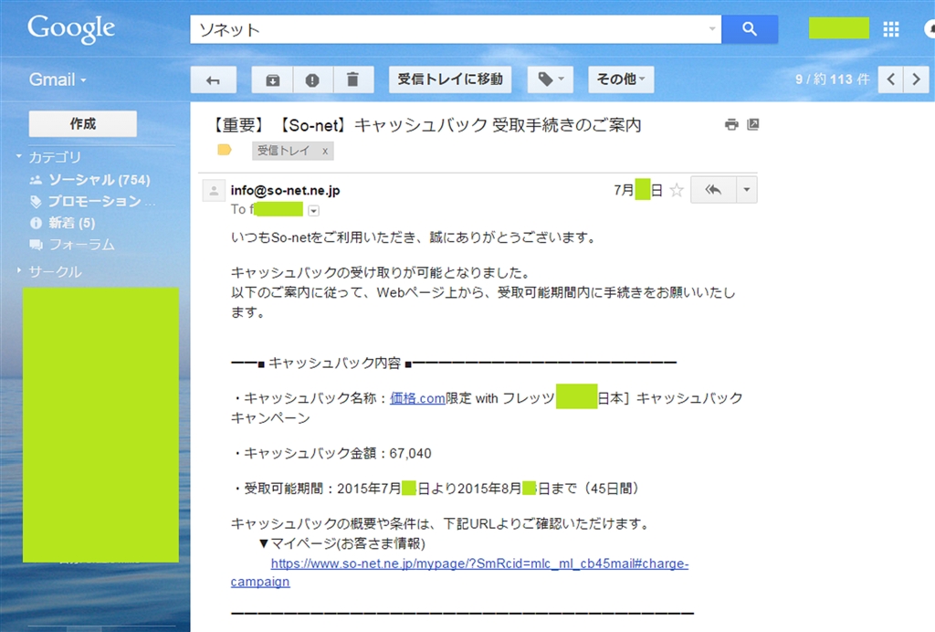 【重要】【So-net】キャッシュバック 受取手続きのご案内