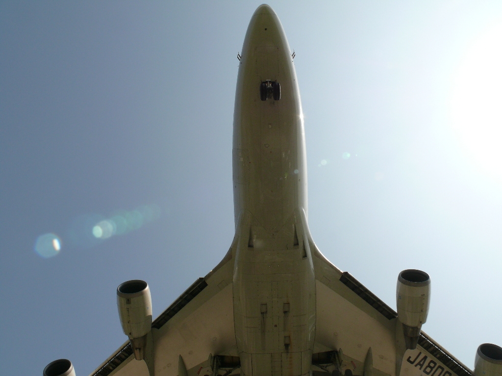 ANAのB747-400。ジャンボは真下で撮るとワイコン使っても左右が切れます