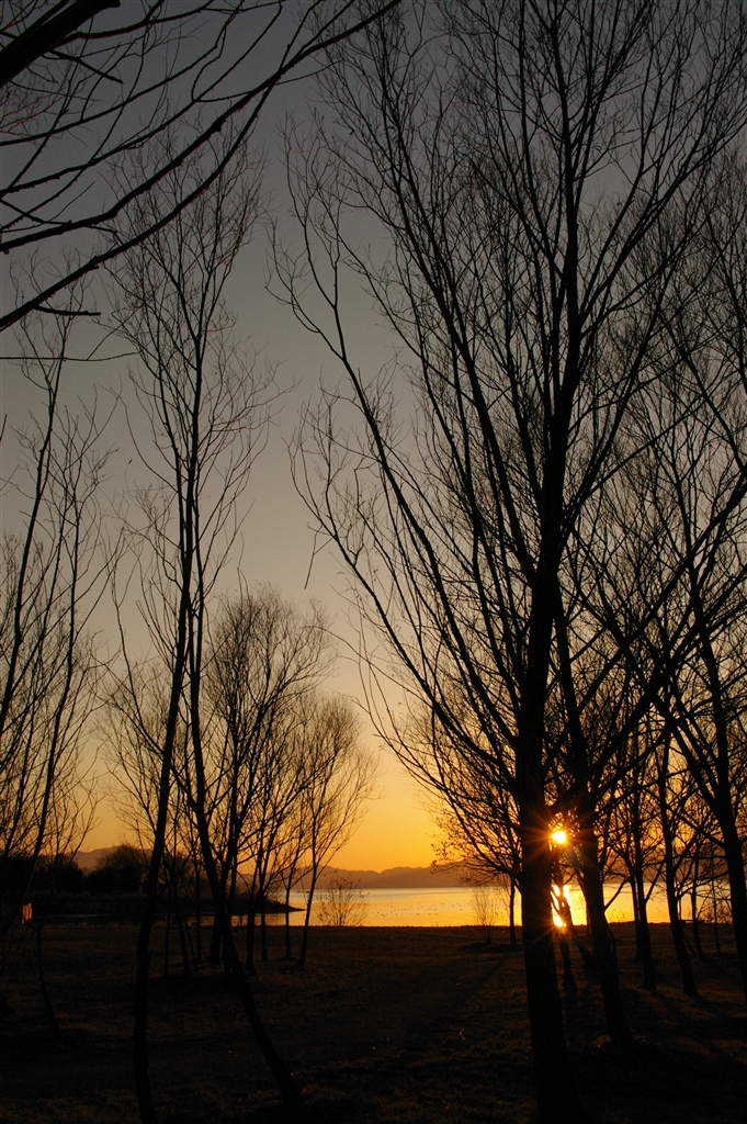 夕暮れの湖岸並木道