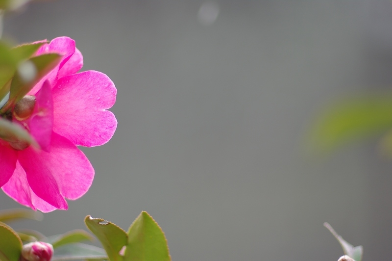 左にある前ボケのピンクはサザンカ