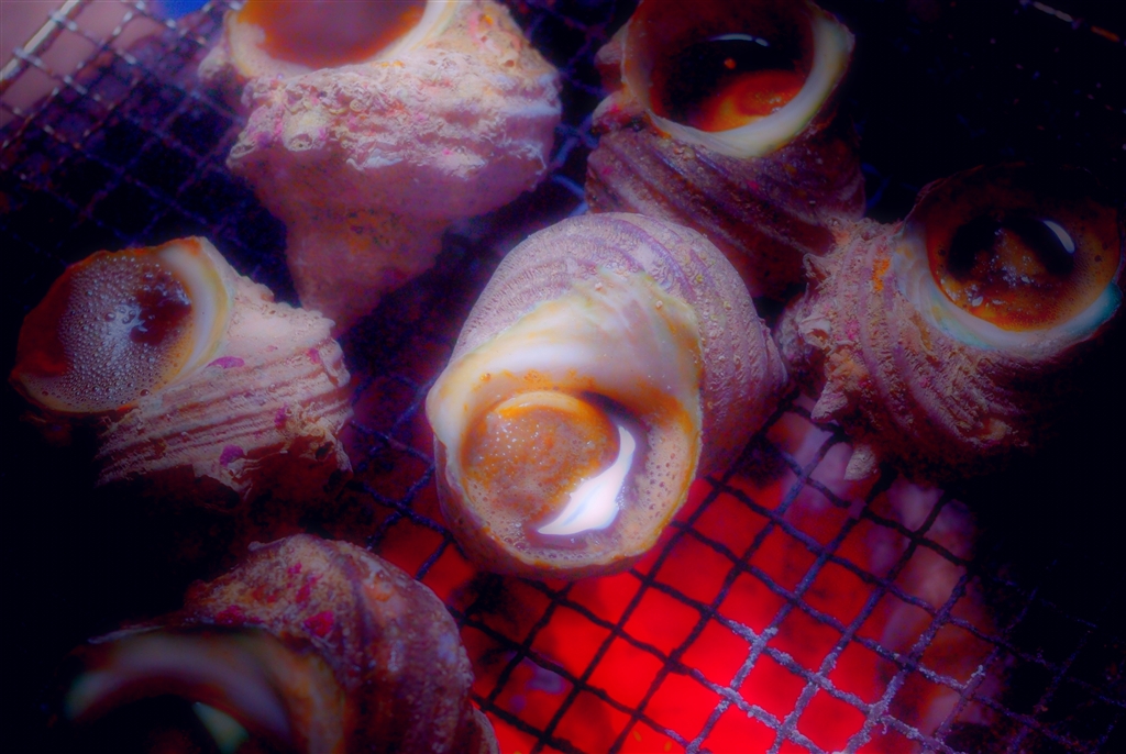 七輪の上に載るサザエ(デジタルフィルター加工)