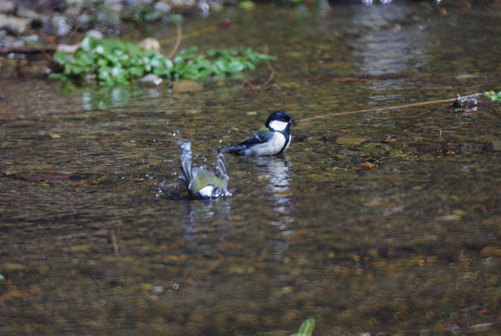 ペアで水浴びするシジュウカラ