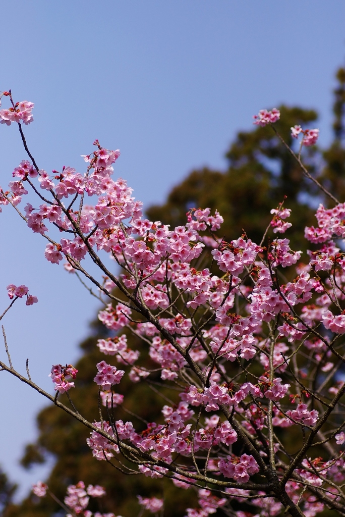 サクラ(品種不明,ソメイヨシノではない) スギの緑と青空を背景にしてみました