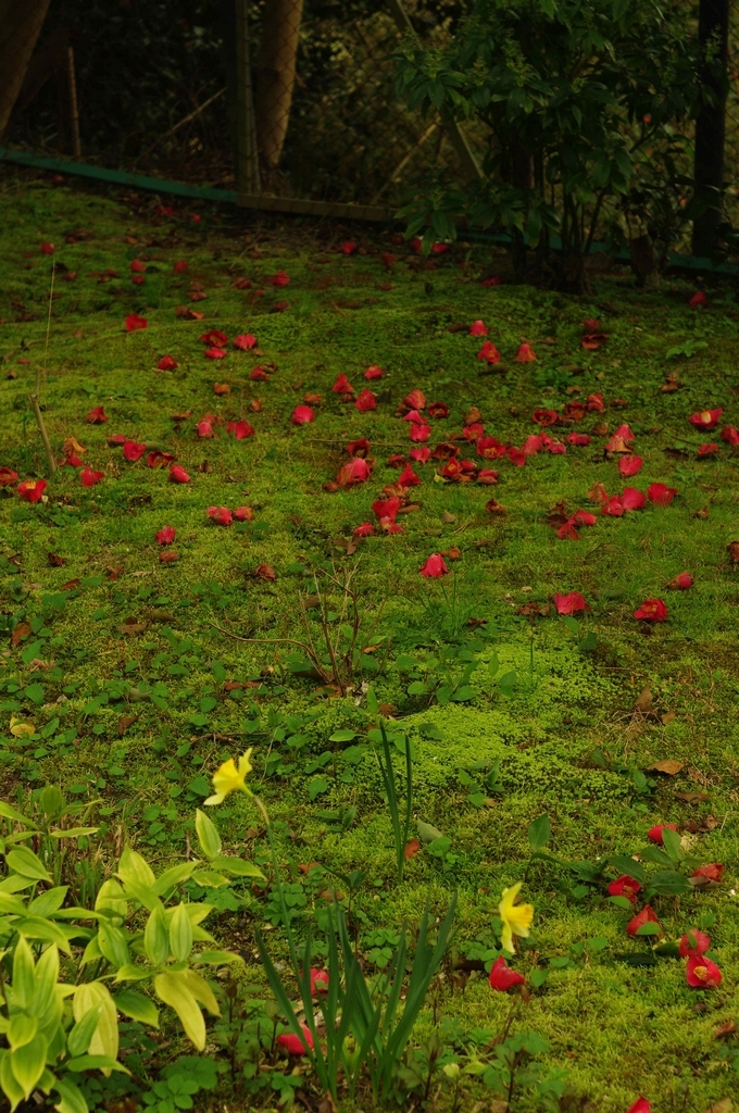 散り椿と苔とスイセン