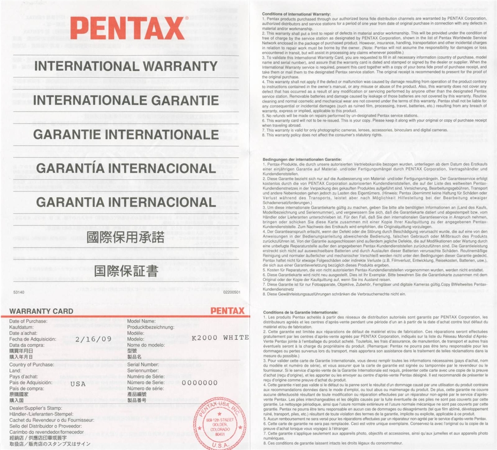 PENTAX K2000 (K-m) white 国際保証書(裏)