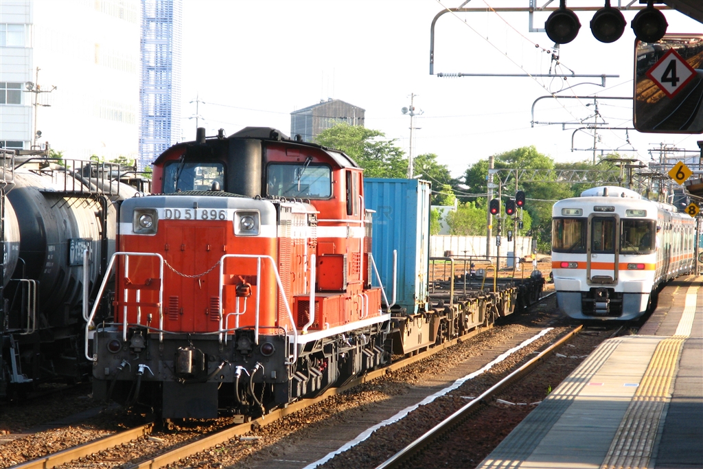 関西線下り列車と上り貨物列車