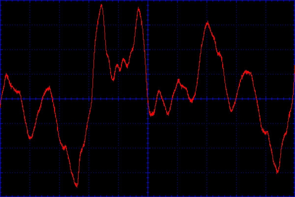 音楽再生(PCオンACタップ抜き):縦1目盛り100mV、横1目盛り5μ秒
