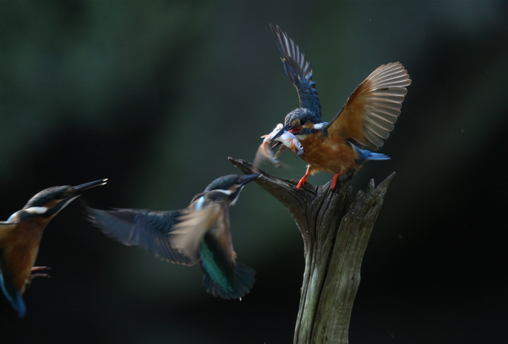 親のカワセミに突進して来た2羽の幼鳥。