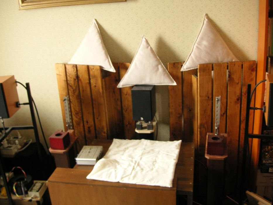 写真3:正面に三角巾、下に吸音布を置く。檜の「簀の子」も拡散用に設置