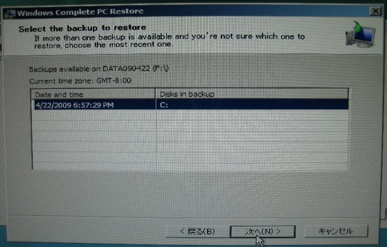 バックアップしたポイント(時系列)を選択する画面です。