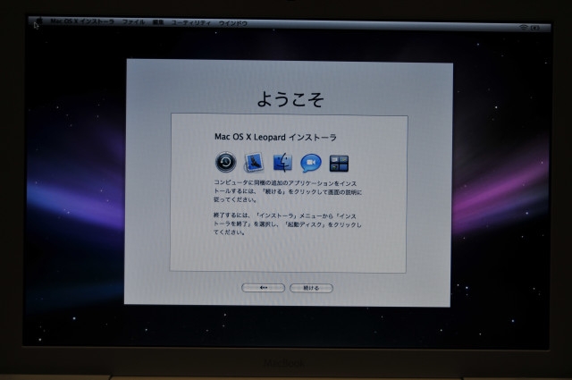 mac付属DVDを入れて日本語を選んだあとの起動画面です。