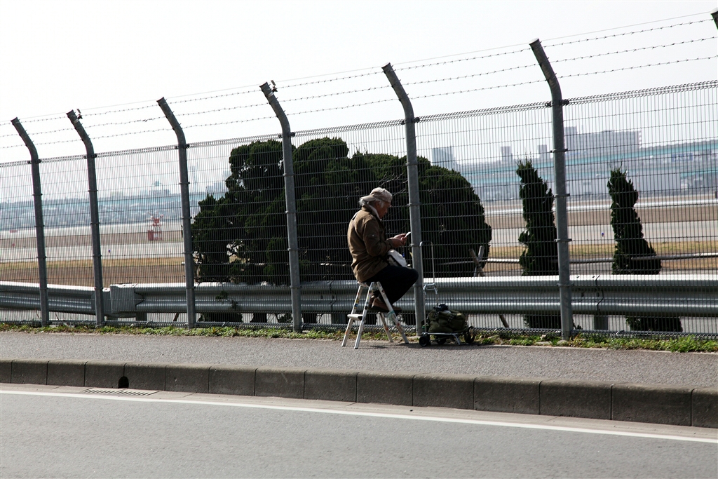 独り、時刻表を見ながら飛行機の発着を待つ老カメラマン