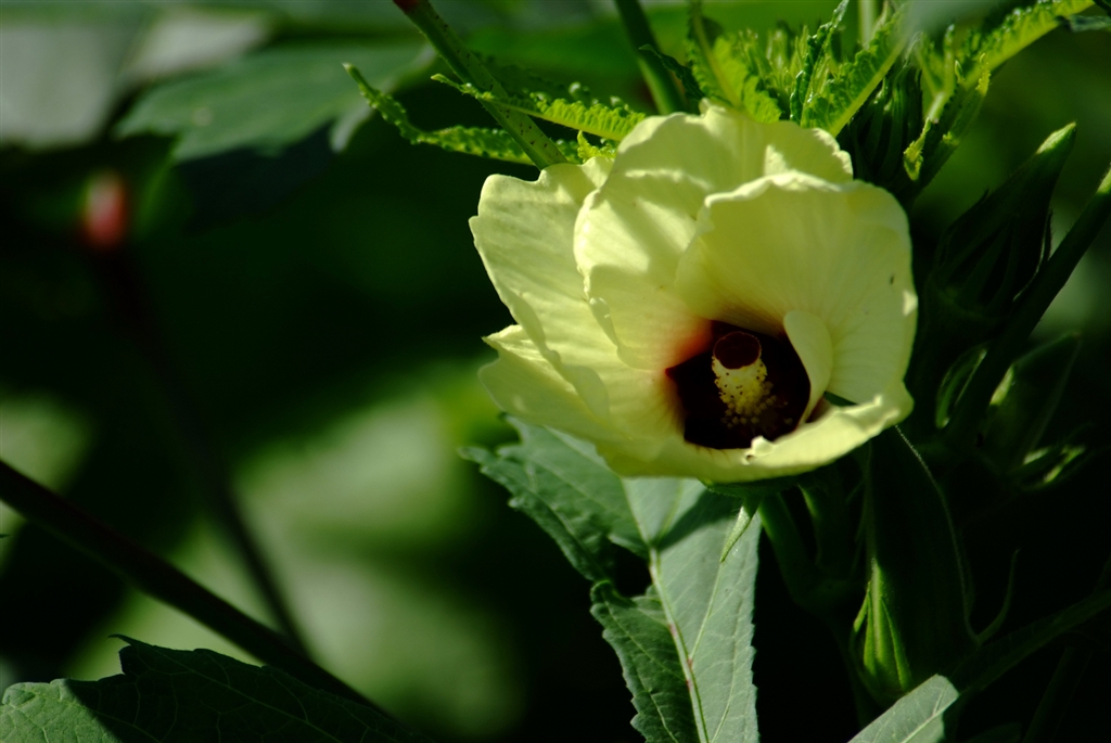 葉の下でそっと咲くオクラ。控え目なところ私そっくり