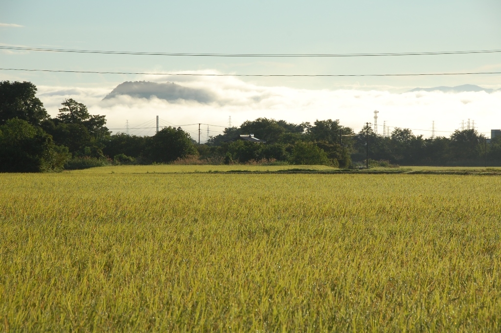 実りの秋。遠くに見えるのは朝靄に浮かぶ信夫山。