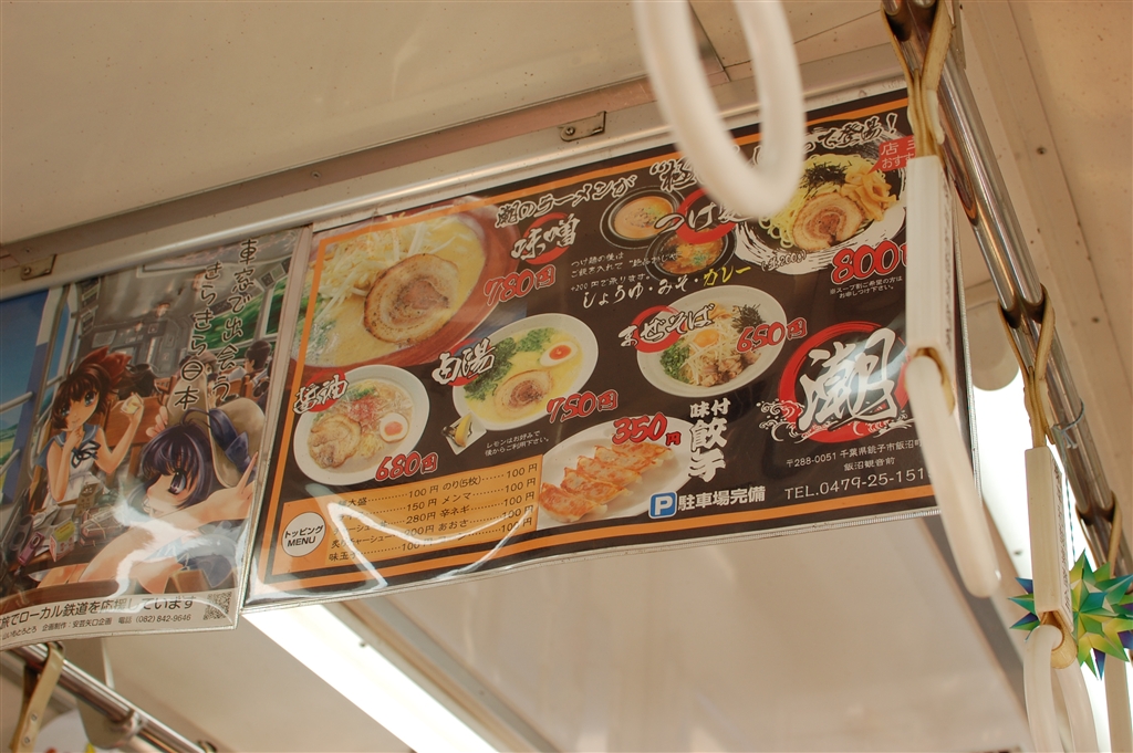 ローカル線の中は、広告もローカル色で一杯