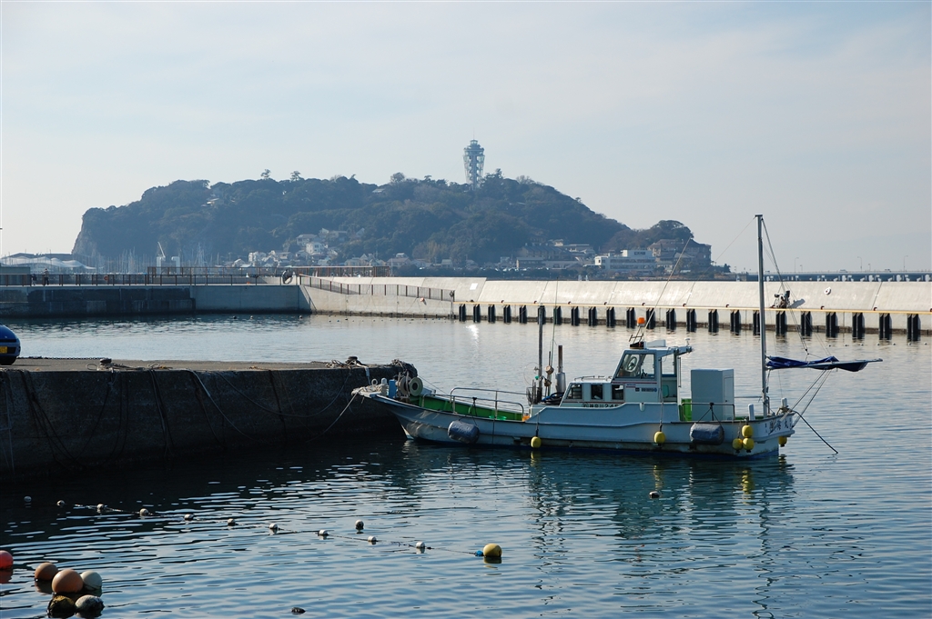 漁船の向こうには江ノ島。