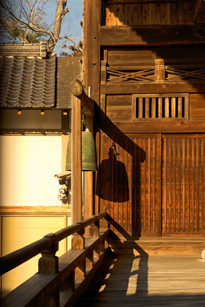 御影堂の板戸には梵鐘の影色濃く落ちる