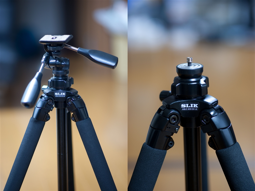 左:どう見ても剛性なさそうな3WAY雲台、右:先端の銀色のものが#148です