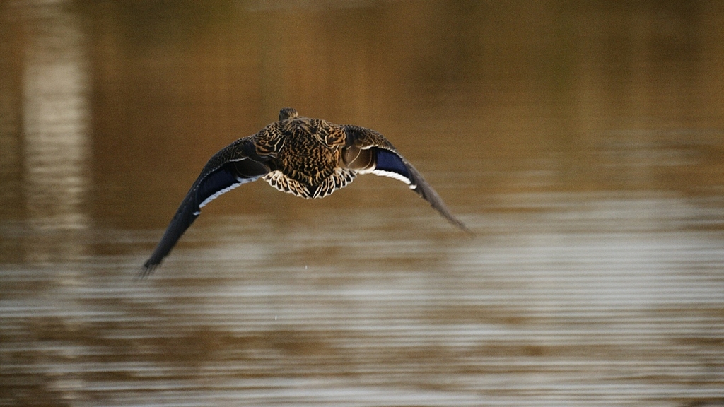 近くから飛び去るカモ