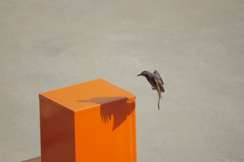 飛び逃げるヒヨ。α700のAFで合焦した珍例(^_^;)