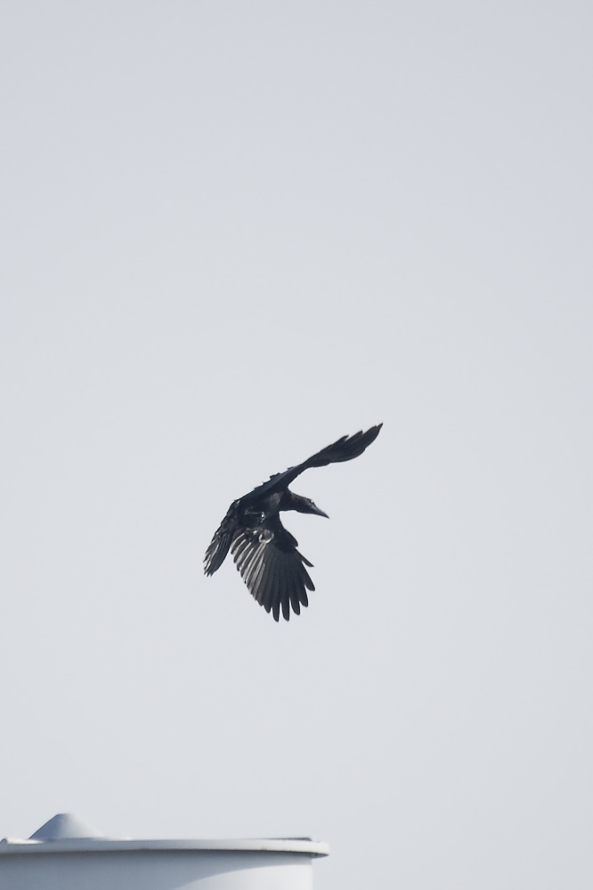 遠くで飛ぶカラスの脚、トリ有り