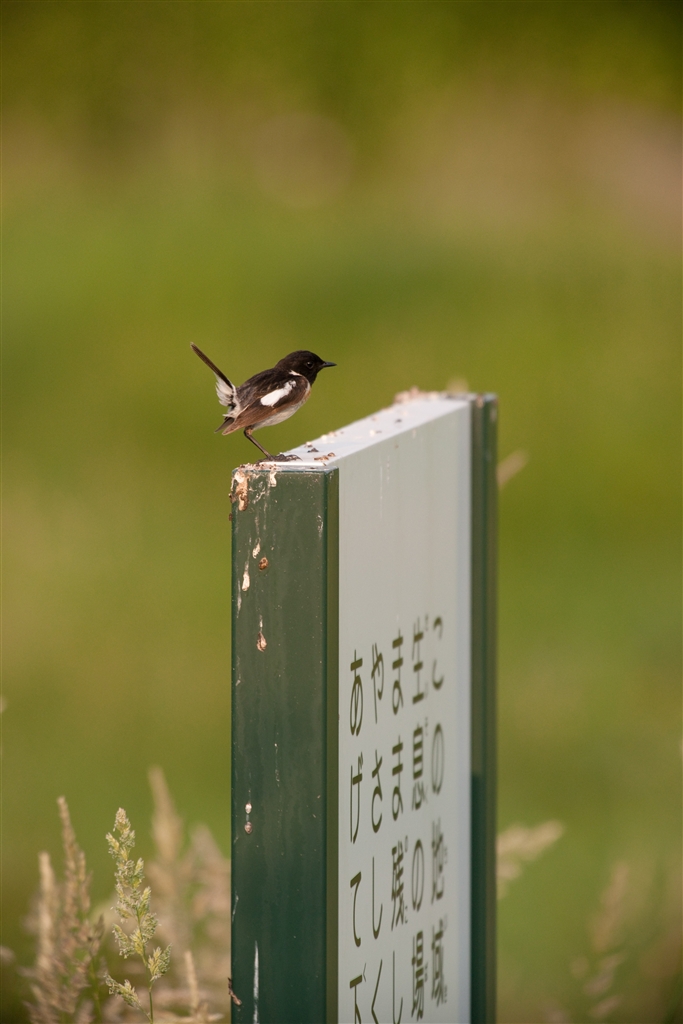 ノビタキ♂:その看板は君達を守っているのに(@_@)