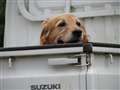 庭の軽トラに乗ってくつろいでいるところです。