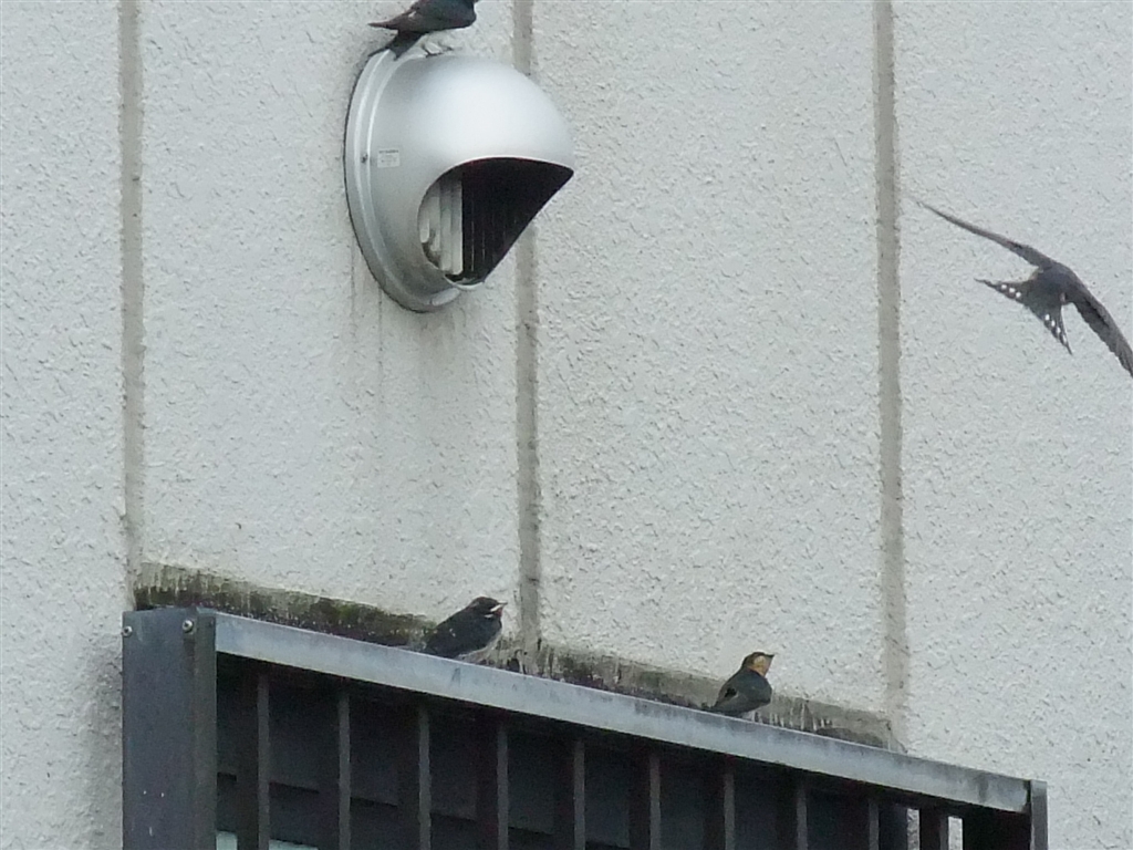 ヒラヒラと自力でひさしまで飛んだ(左の鳥)一緒に落ちたもう一羽は行方不明。