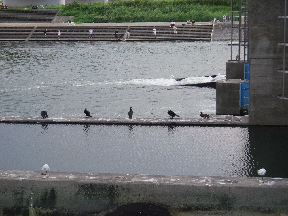 手前からサギ、川鵜、人類