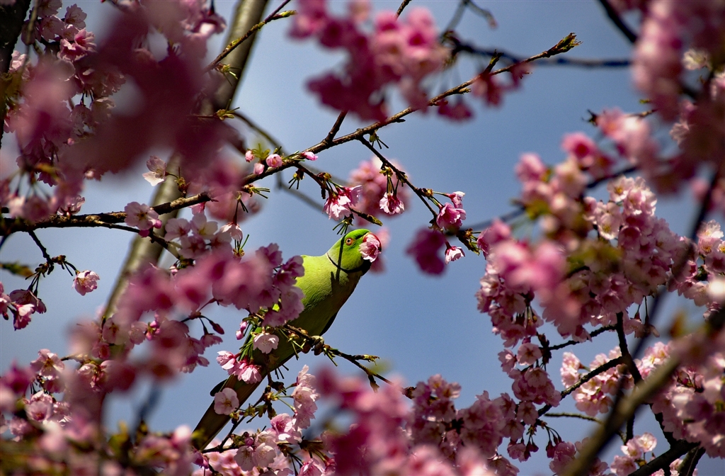 寒桜 野生のインコが花をちぎり落とします 多分根本が甘いのだろうと